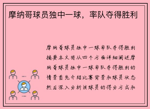 摩纳哥球员独中一球,率队夺得胜利摘要:本文将从四个方面详细阐述摩纳哥球员独中一球,率队夺得胜利的情景。首先介绍比赛背景和球员状态,然后深入分析该球员的得分方式和相关战术部署,接着阐述球员的决胜表现对球队取得胜利的重要性,最后从个人表现和团队合作两个方面总结该球员的表现。1、比赛背景和球员状态摩纳哥与...